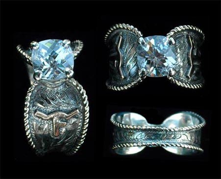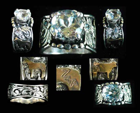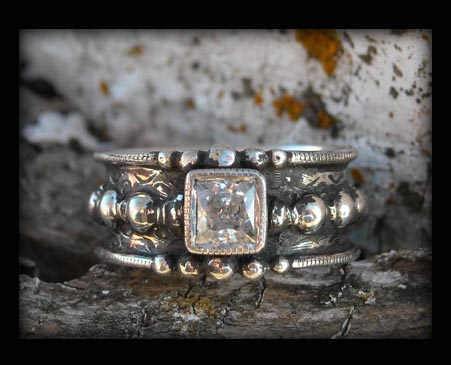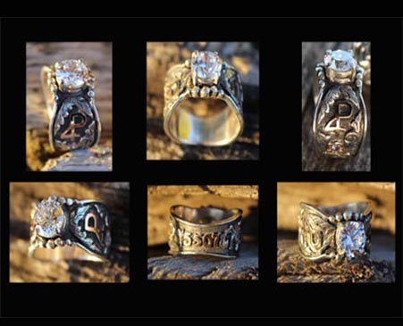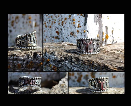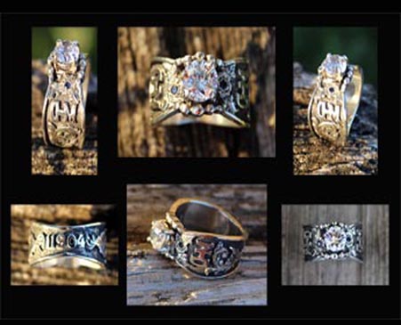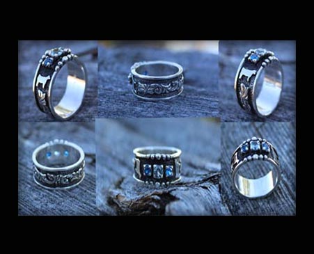 Rings are limited only to the imagination. Sterling ring base prices starts $245, cost will vary dramatically with design, metals, and stones used. Sterling, 14k gold fill, 14k white gold, 14k rose gold, 14k yellow gold, and a wide variety of stones are available. All of our items are completey handmade, one piece at a time. Please allow at least 6-8 weeks for working time and delivery. |